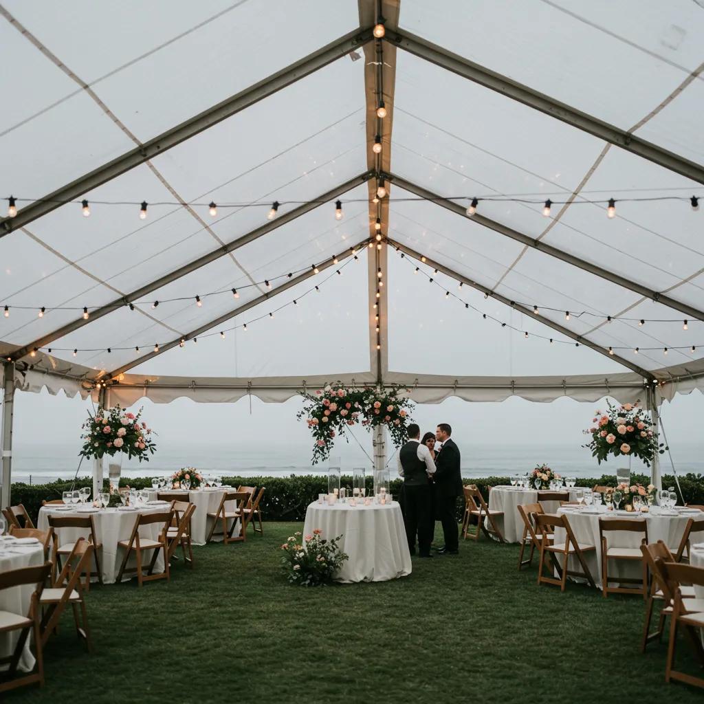 A Clear Top Tent is perfect for preserving panoramic views and maximizing natural light, thanks to its transparent roofing that brings the stunning coastal scenery right into your reception space. This feature enhances your wedding photography and creates an airy, open feel while still providing essential overhead protection. It’s particularly valuable for backyards with breathtaking ocean or hillside vistas. When planning installation, consider anchoring methods and subtle lighting to avoid glare; low-profile string lights or elegant suspended fixtures can add evening warmth without compromising the clear-top effect.