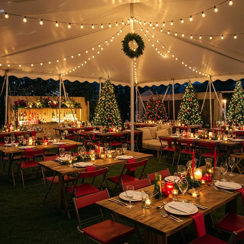 | Classic Christmas | Tent, upgraded linens, chargers, elegant centerpieces, charming string lighting. | Formal plated events and sophisticated corporate holiday parties |