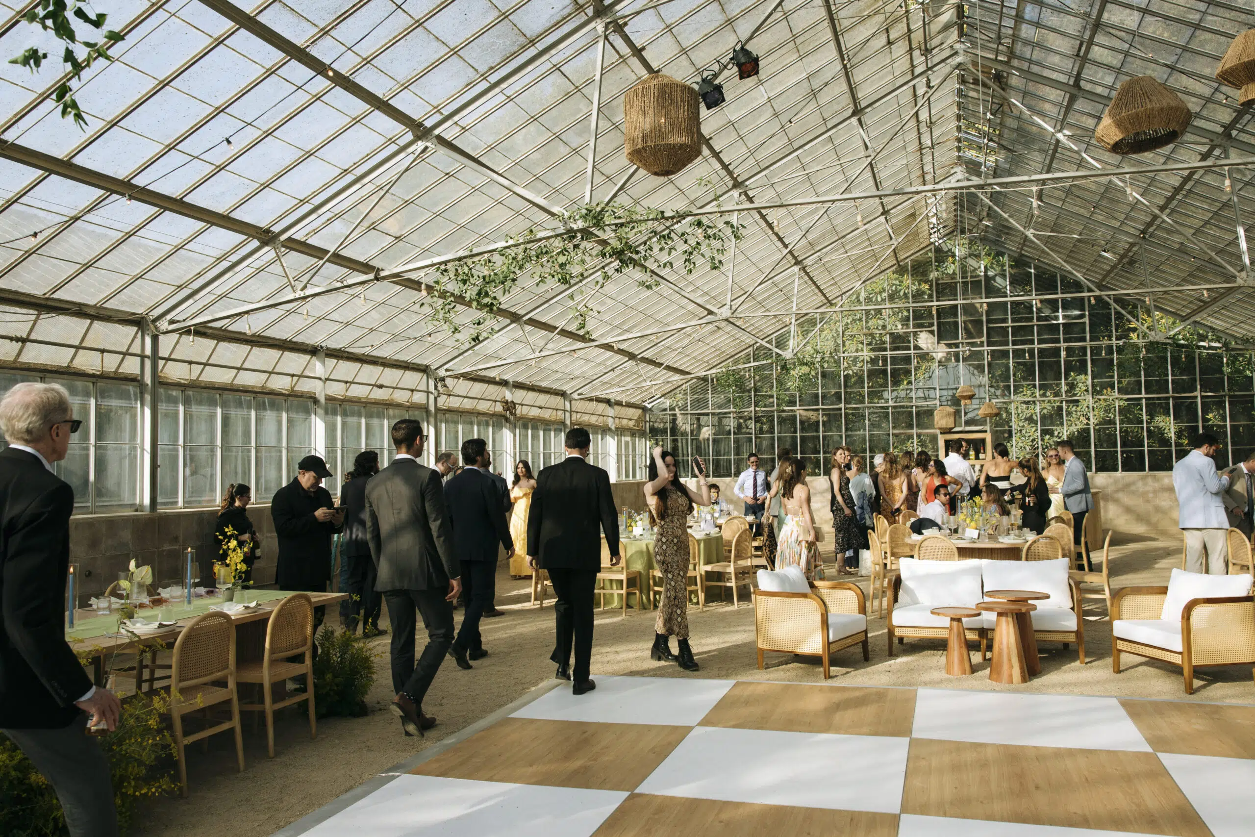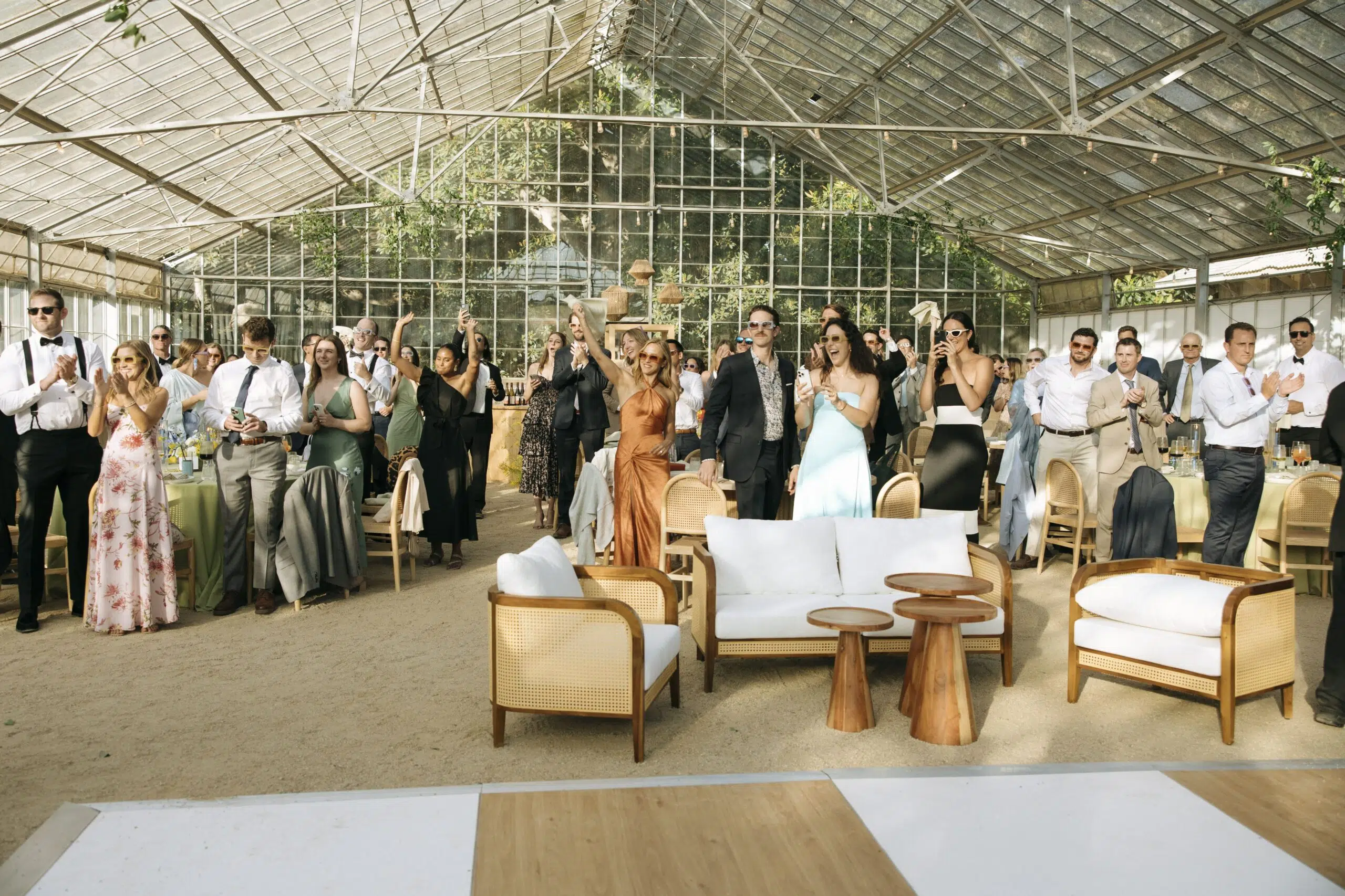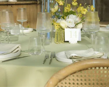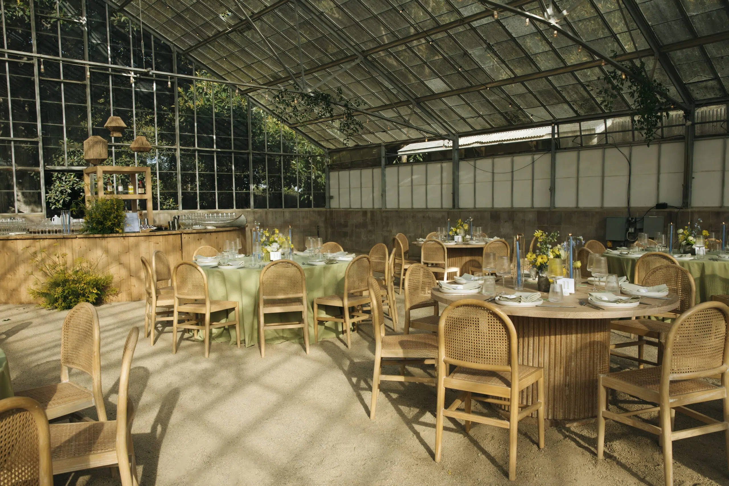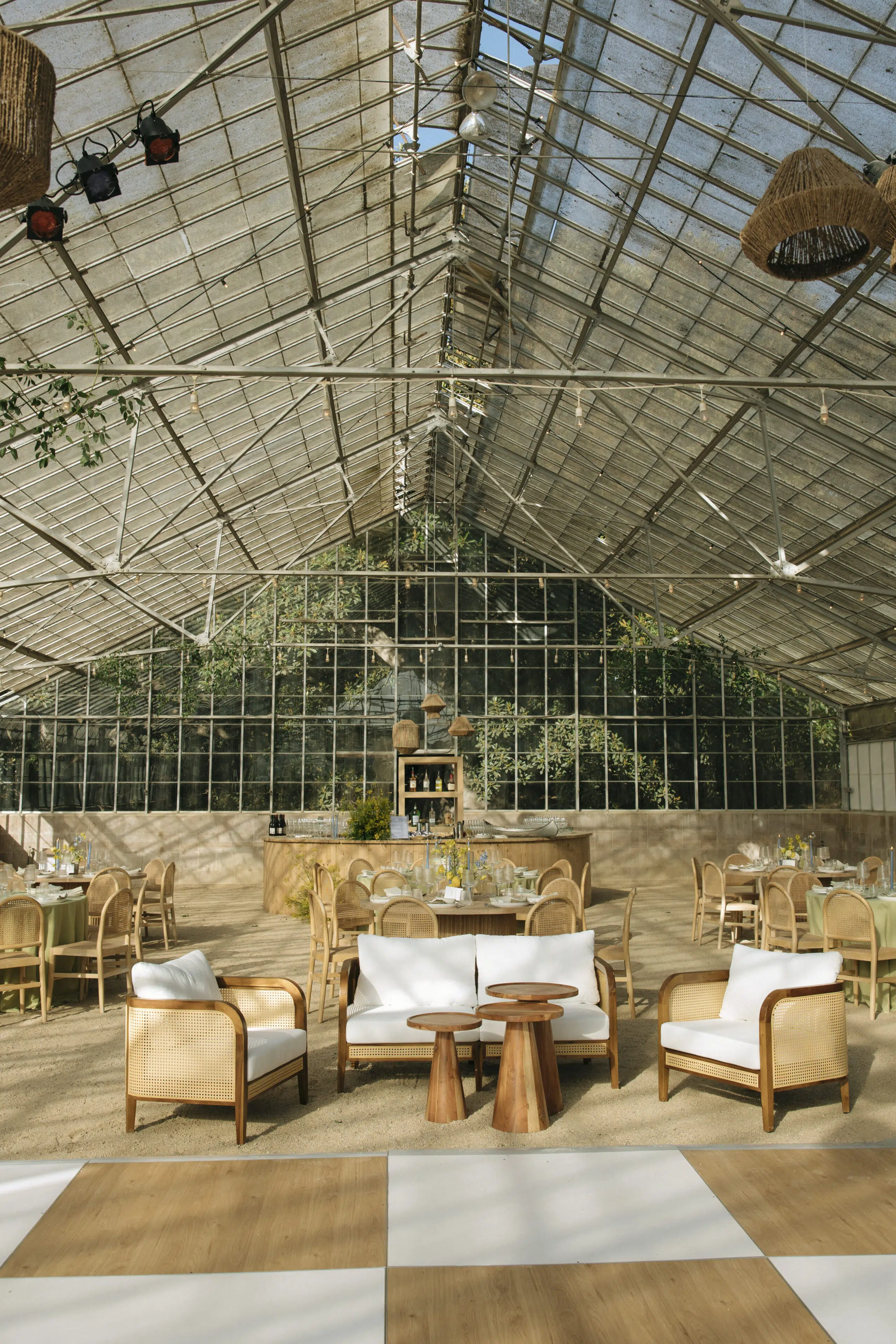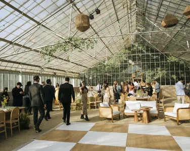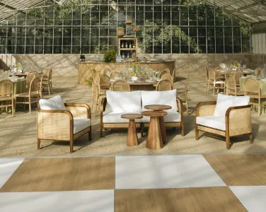 This romantic rustic wedding in Santa Barbara, CA combined the charm of an outdoor reception with the beauty of a greenhouse celebration. Ventura Rentals styled the event with elegant seating using the Capri Folding Chair, intimate dining around the Round Table, and soft tones brought by the Celadon Polyester Linen. Guests enjoyed artisanal touches with the Stella Cotton Stoneware, refined details from the Dragonfly Flatware, and sparkle from the Verona Ridged Glassware. The bar area stood out with the rustic Wood Plank Grand Full Circle Bar, while the glow of the Langing Pendant Light Rattan Lantern created a warm atmosphere. Cozy lounge moments were set with the Loveseat Amalfi and Amalfi Chair, and the celebration came alive with a Disco Ball above the Wood & White Dance Floor.