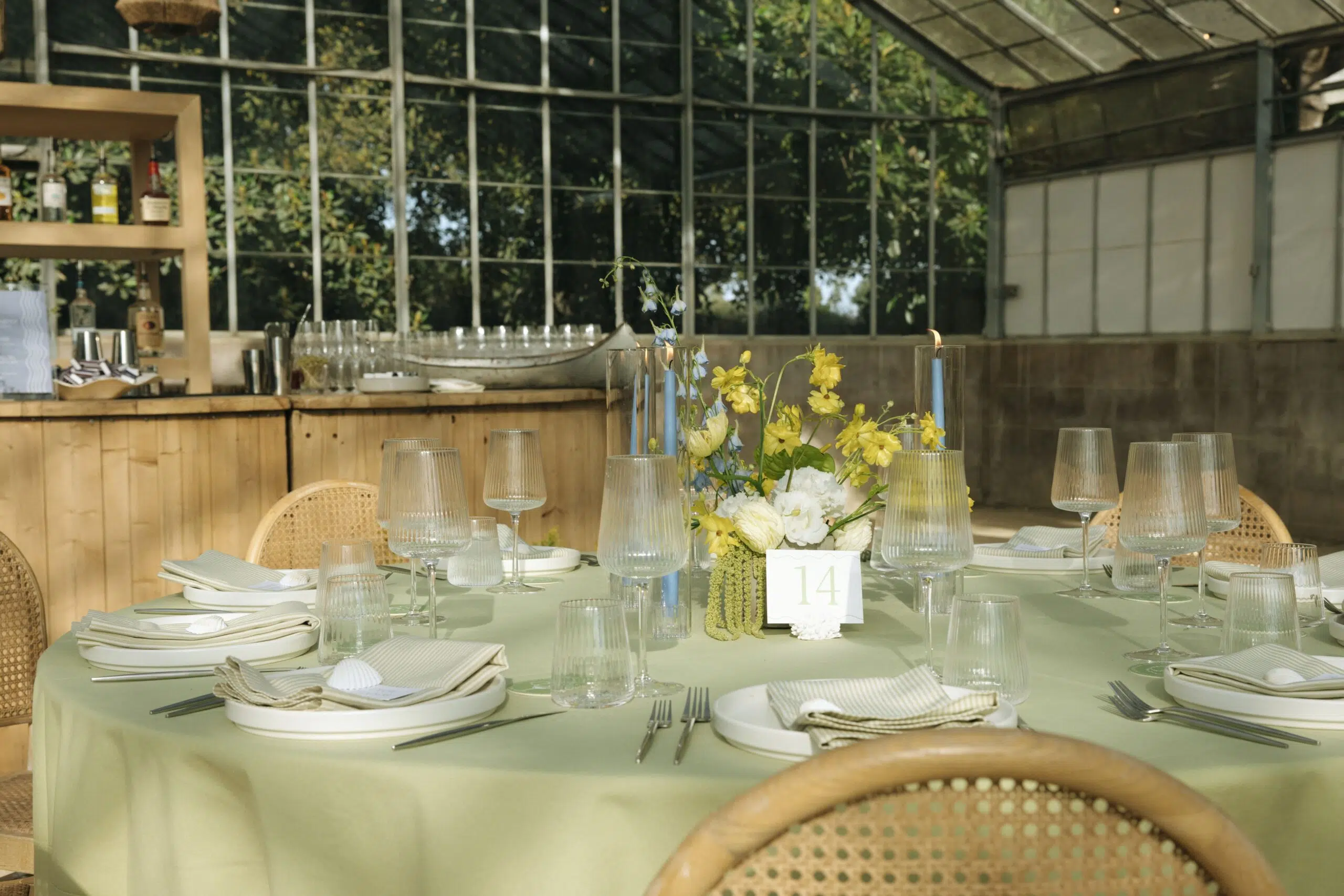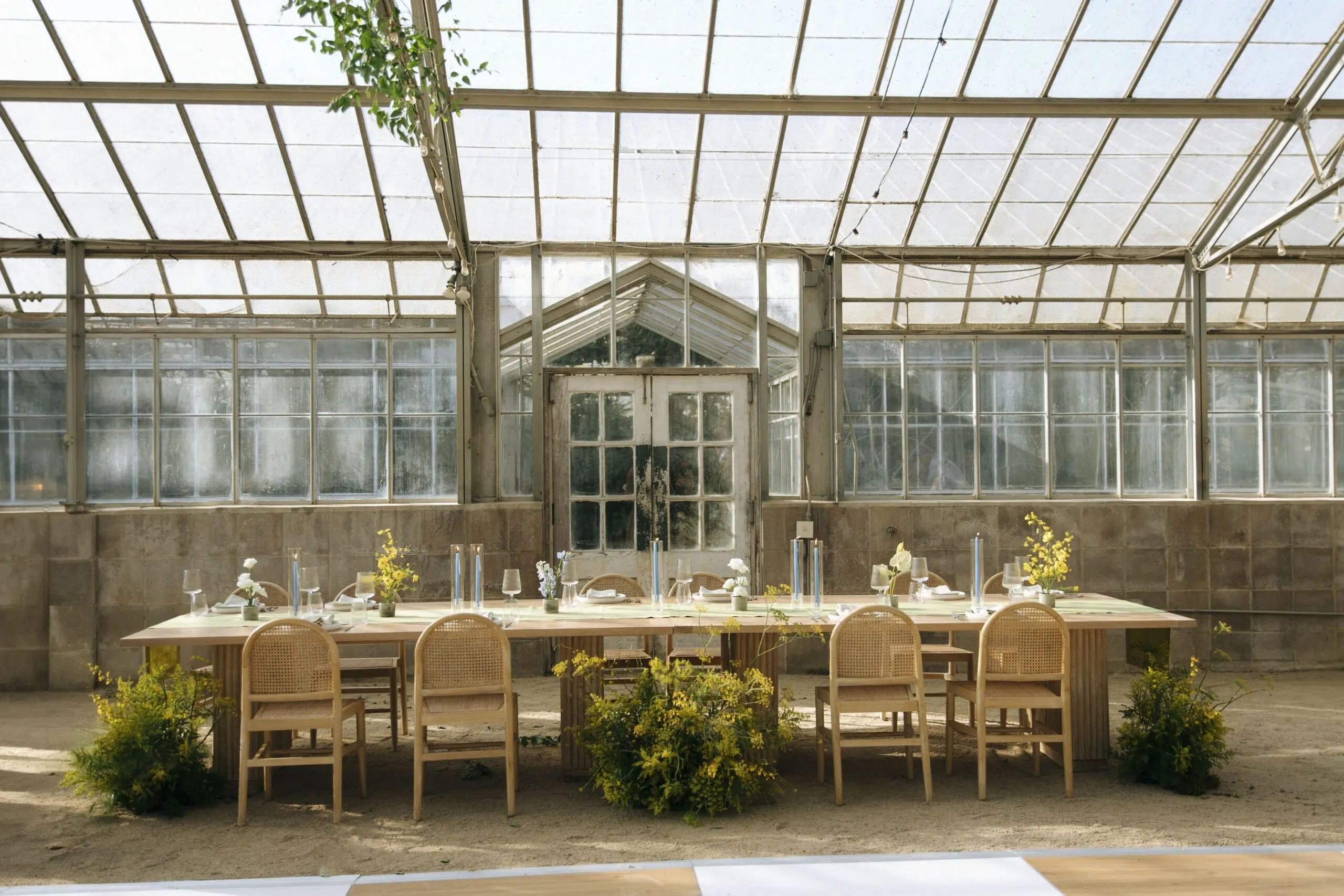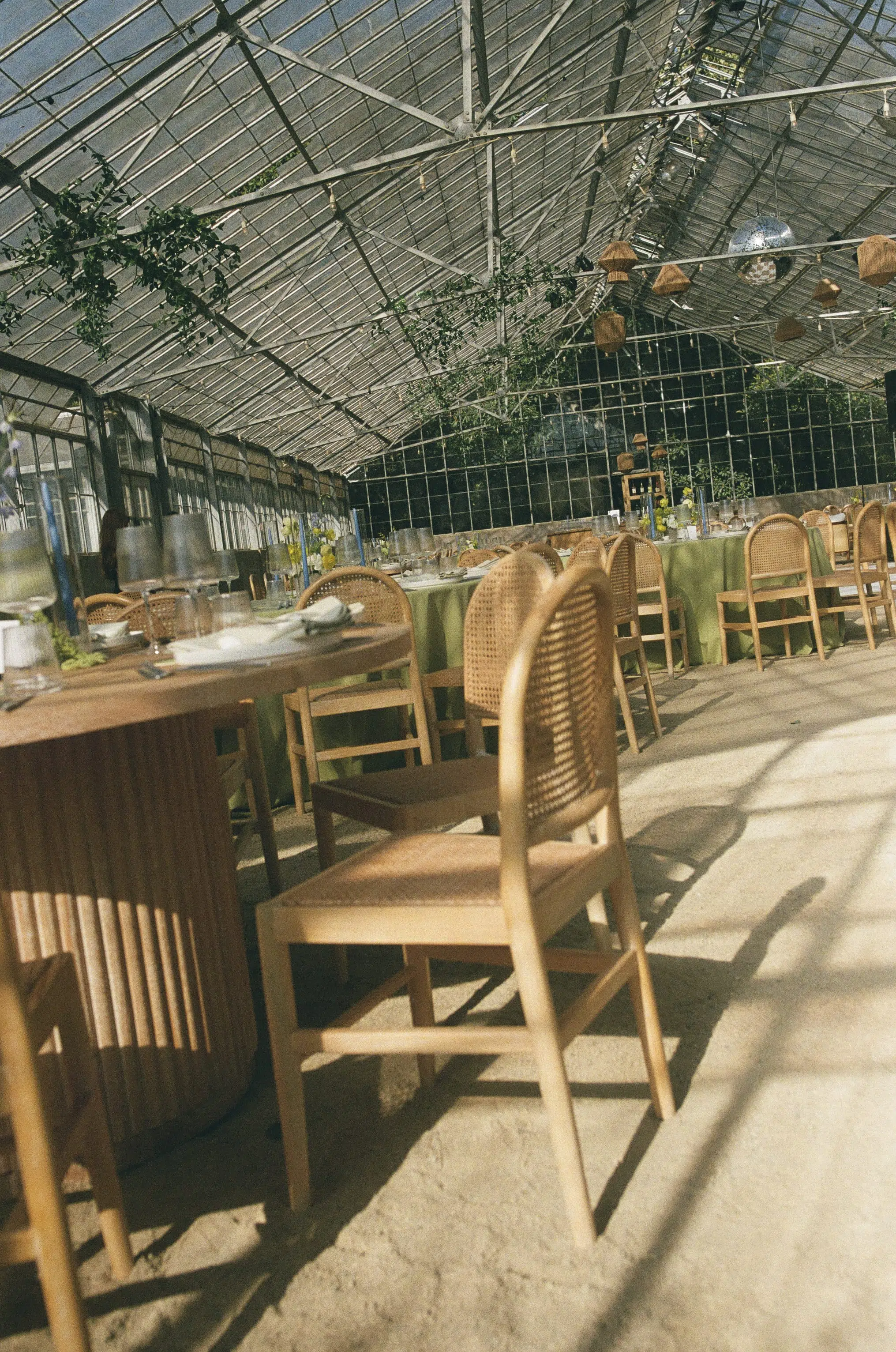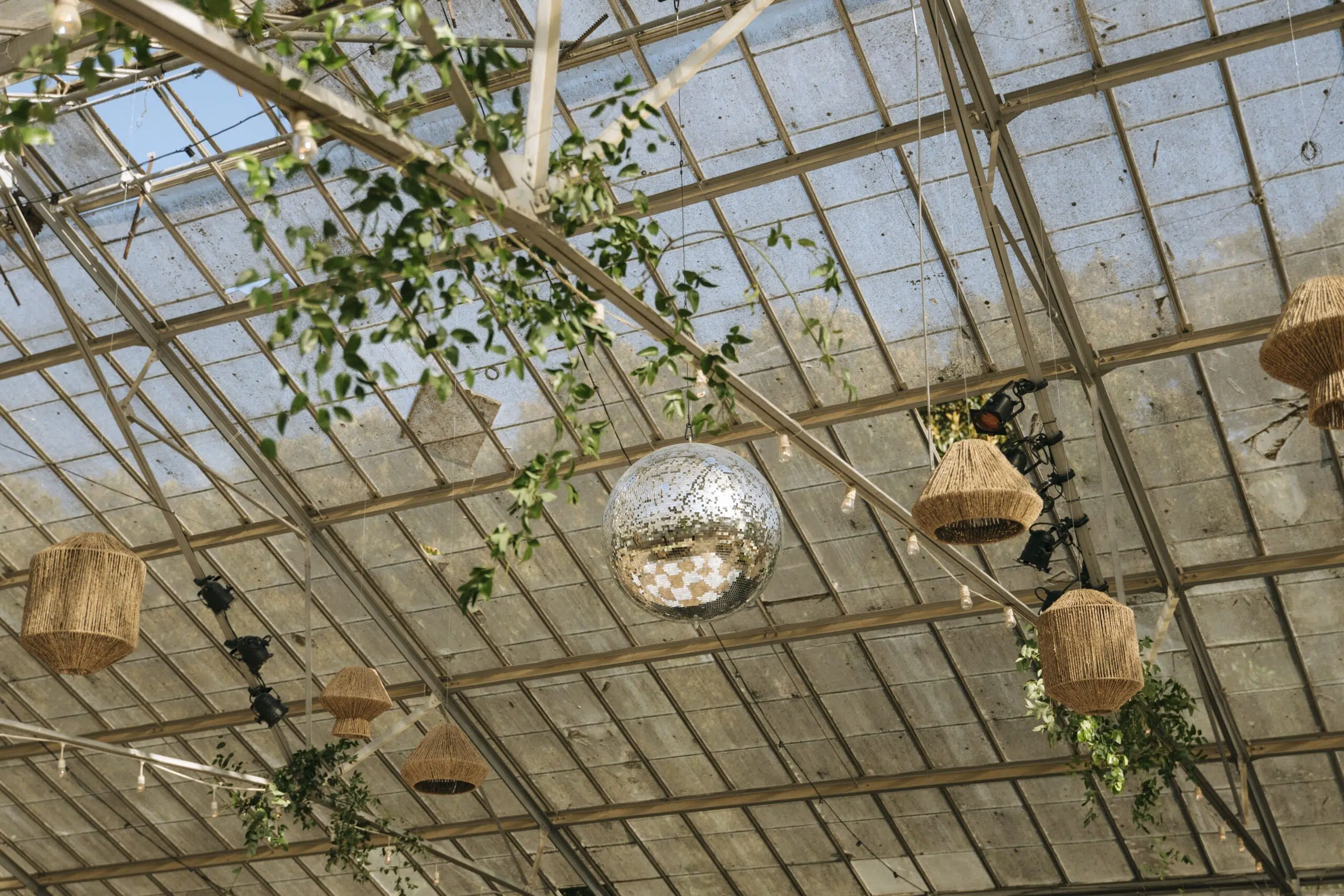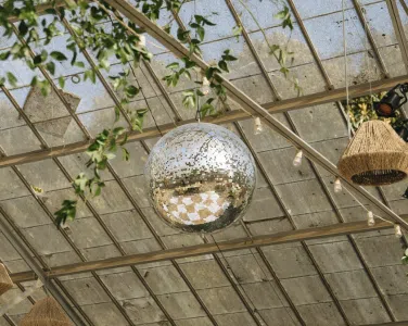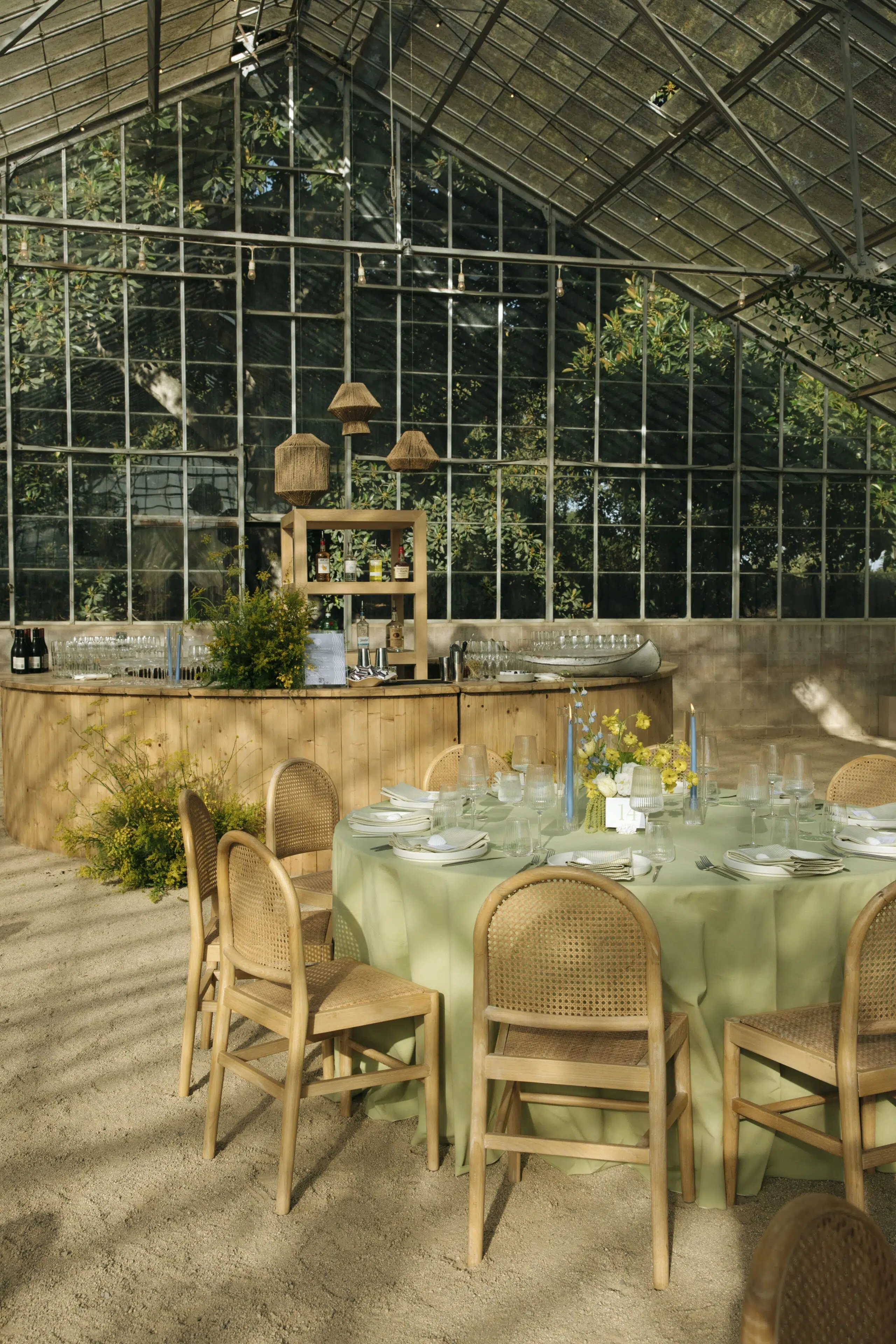 This romantic rustic wedding in Santa Barbara, CA combined the charm of an outdoor reception with the beauty of a greenhouse celebration. Ventura Rentals styled the event with elegant seating using the Capri Folding Chair, intimate dining around the Round Table, and soft tones brought by the Celadon Polyester Linen. Guests enjoyed artisanal touches with the Stella Cotton Stoneware, refined details from the Dragonfly Flatware, and sparkle from the Verona Ridged Glassware. The bar area stood out with the rustic Wood Plank Grand Full Circle Bar, while the glow of the Langing Pendant Light Rattan Lantern created a warm atmosphere. Cozy lounge moments were set with the Loveseat Amalfi and Amalfi Chair, and the celebration came alive with a Disco Ball above the Wood & White Dance Floor.