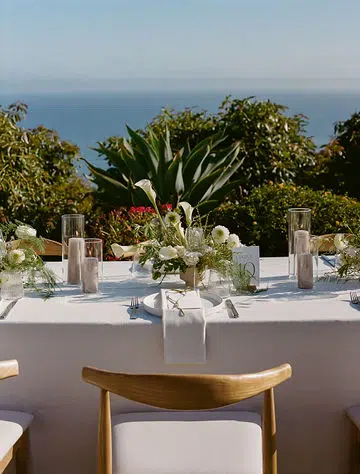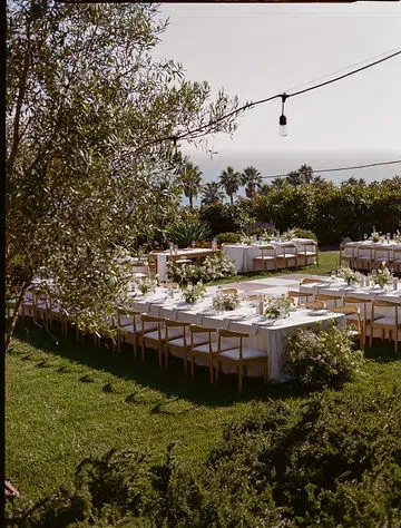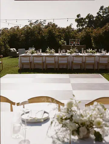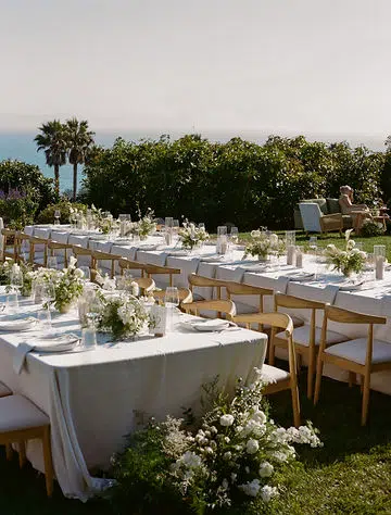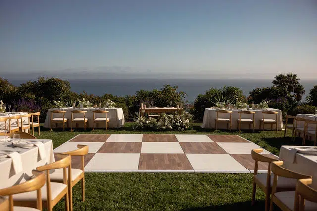 Against the sweeping coastal backdrop of Regina Ranch in Carpinteria, this al fresco wedding wove together rustic textures, intimate details, and a softly romantic palette. Ventura Rentals provided the elegant structure and subtle sophistication through every element: guests were welcomed on Hand Woven Folding Chair for the ceremony, gathered at long Banquet Table settings dressed in Cambria Natural Linen, dined using Stella Cotton Stoneware, and enjoyed refreshments served with Metro Stainless Flatware and Verona Ridged Glassware. The focal point for drinks and mingling was the charming Meadow Wood Bar, which anchored the design in warm, organic beauty. As dusk fell and the stars appeared, the Wood & White Dance Floor invited couples and guests to dance the night away in style—its elegant blend of wood tones and crisp white panels created a breathtaking centerpiece under the open sky.The result: a day that felt both grounded in nature and elevated by thoughtful detail, where every piece told a story of love, craftsmanship, and quiet elegance.