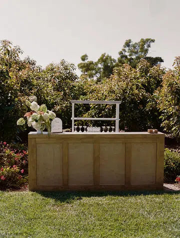 Behind the signature cocktail hour was the Meadow Wood Bar, a rustic yet elegant focal point. Its warm wood tones and simple structure integrated seamlessly with the ranch setting, offering a welcoming station for drinks and gathering that felt natural to the venue aesthetic..