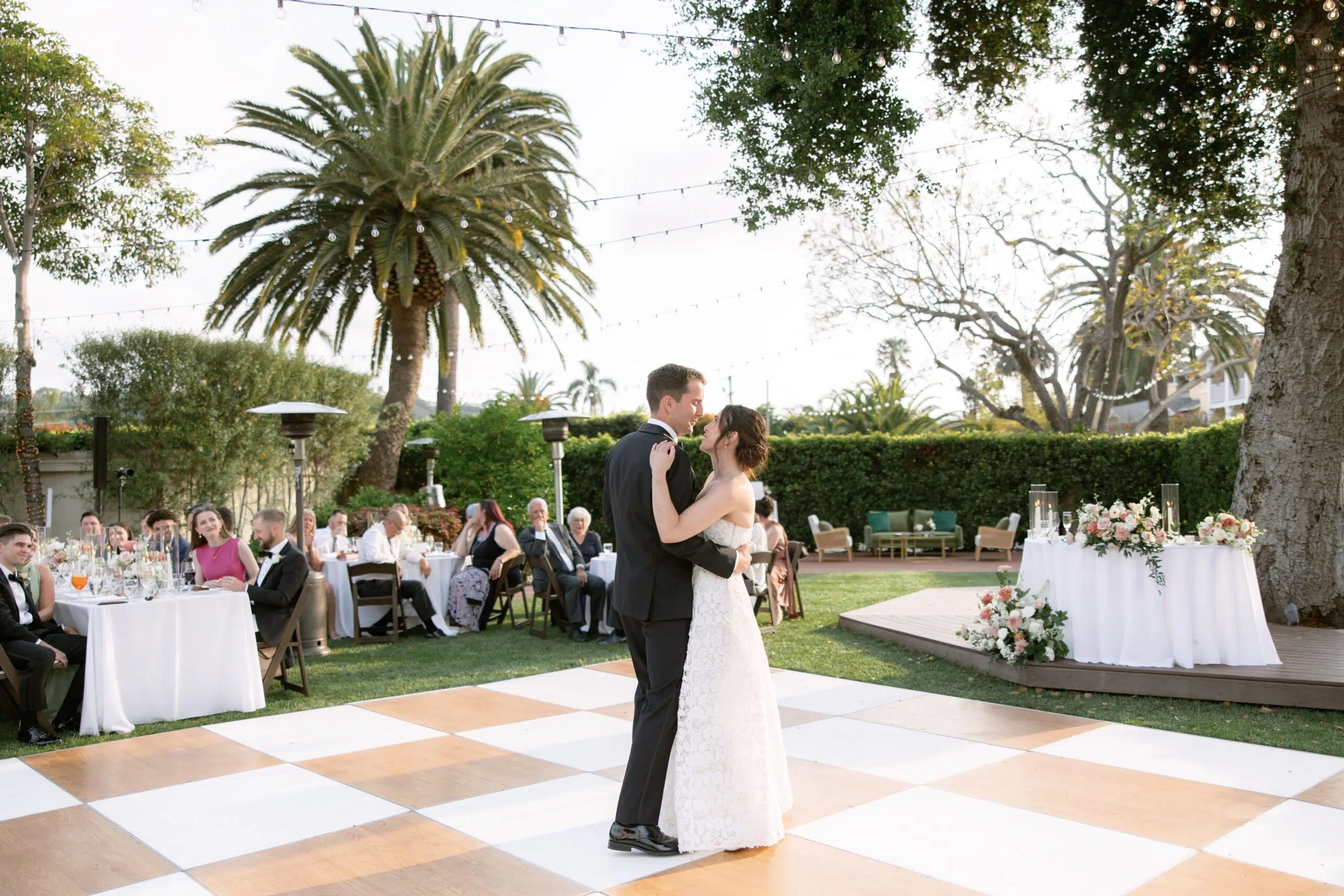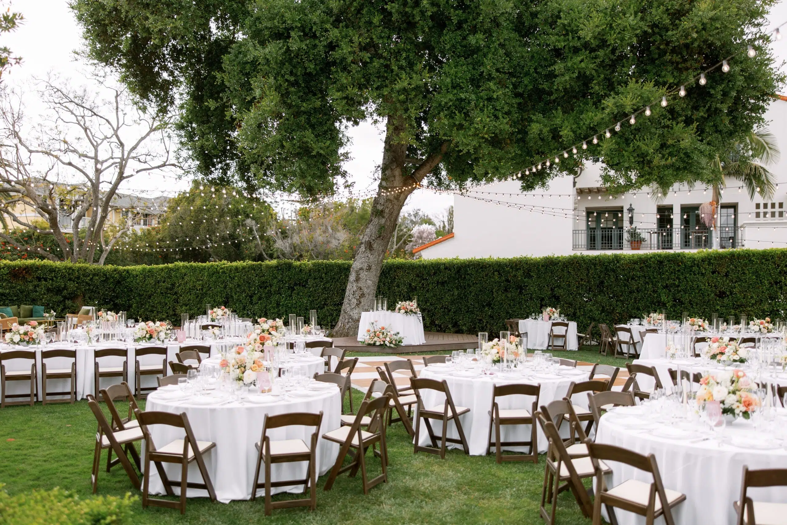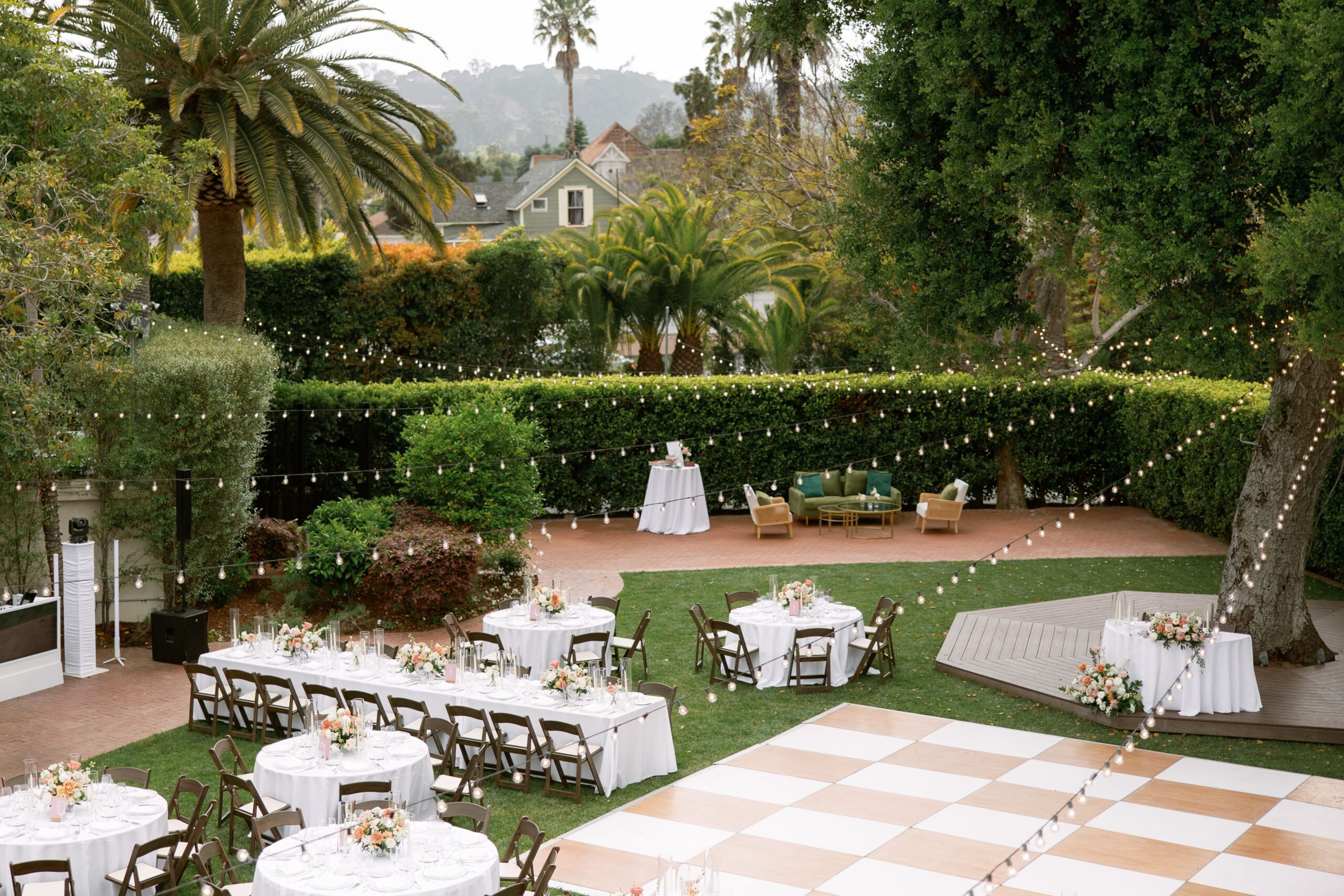 Set in the stunning outdoor gardens of the Santa Barbara Club in Santa Barbara, CA, this wedding beautifully combined rustic warmth with refined elegance. Guests were welcomed by rows of Fruitwood Folding Chair that framed the ceremony space, leading to reception tables dressed in White Polyester Linen and set with Metro Stainless Flatware and sparkling Daily Wine, Iced Beverage Watter Glass, and Champagne Flute. Cozy lounge areas featuring the Olive Green Velvet Sofa and Amalfi Chair invited guests to relax, while the elegant Wood & White Dance Floor became the heart of the celebration under a canopy of glowing Bistro Lighting W/Stands.