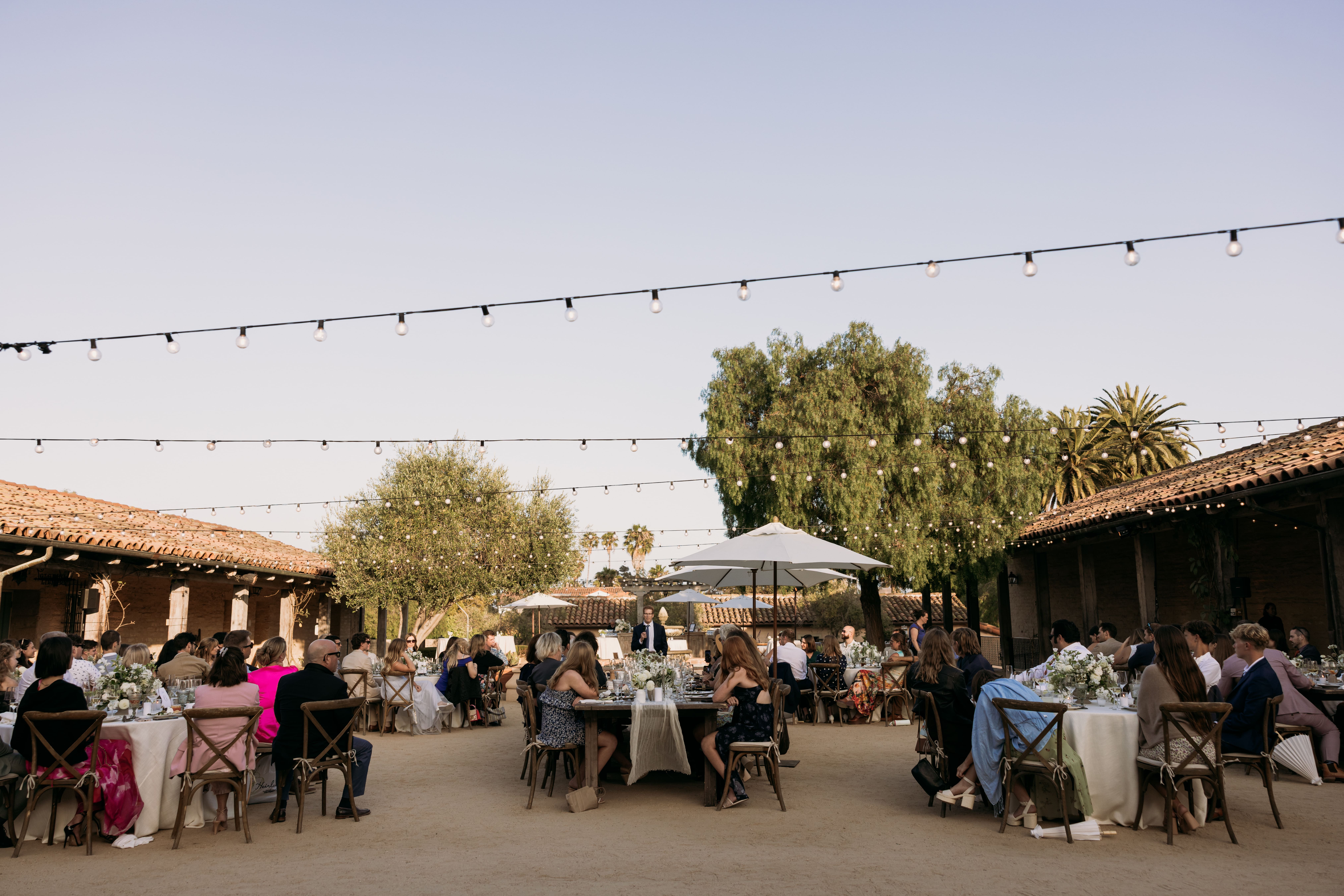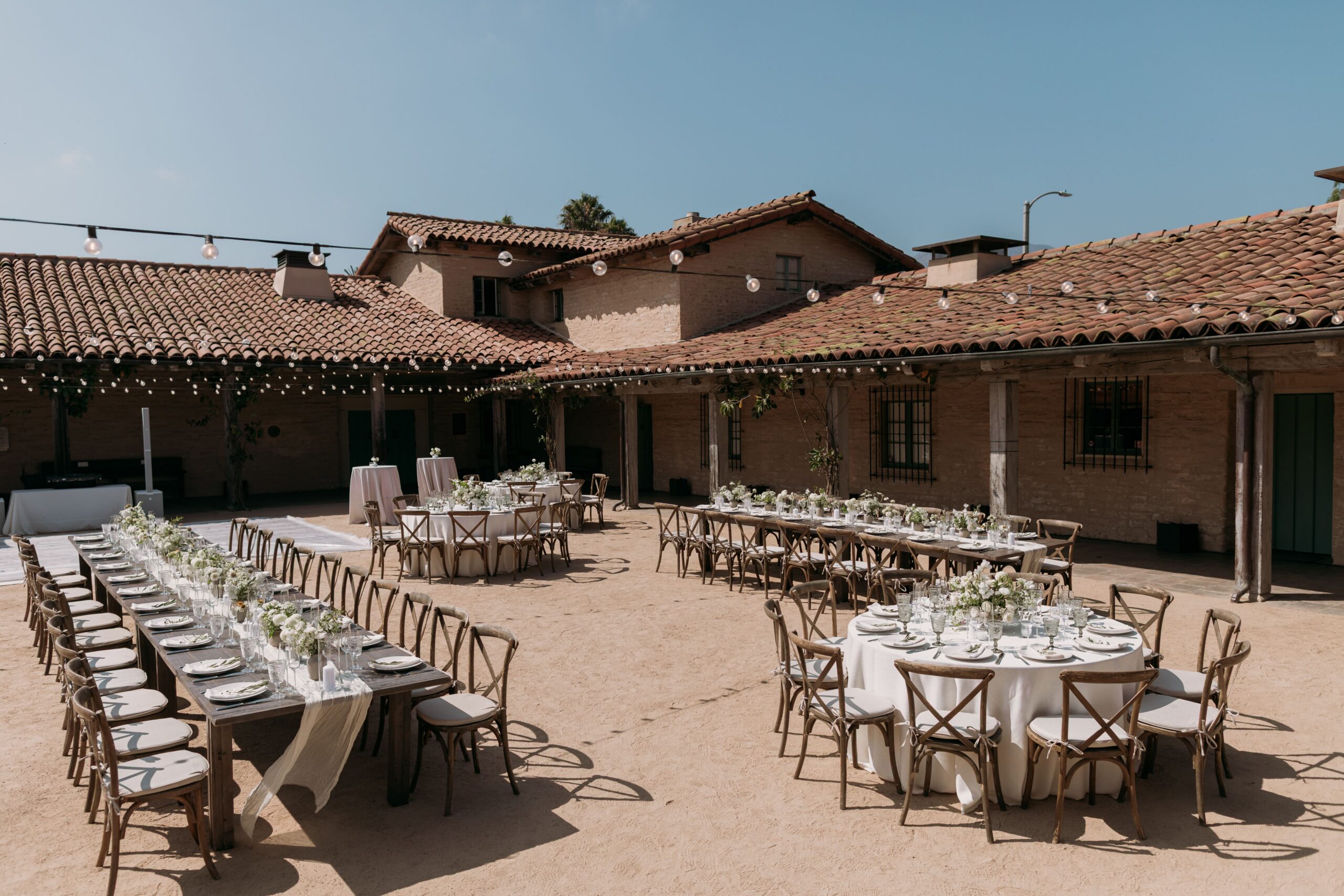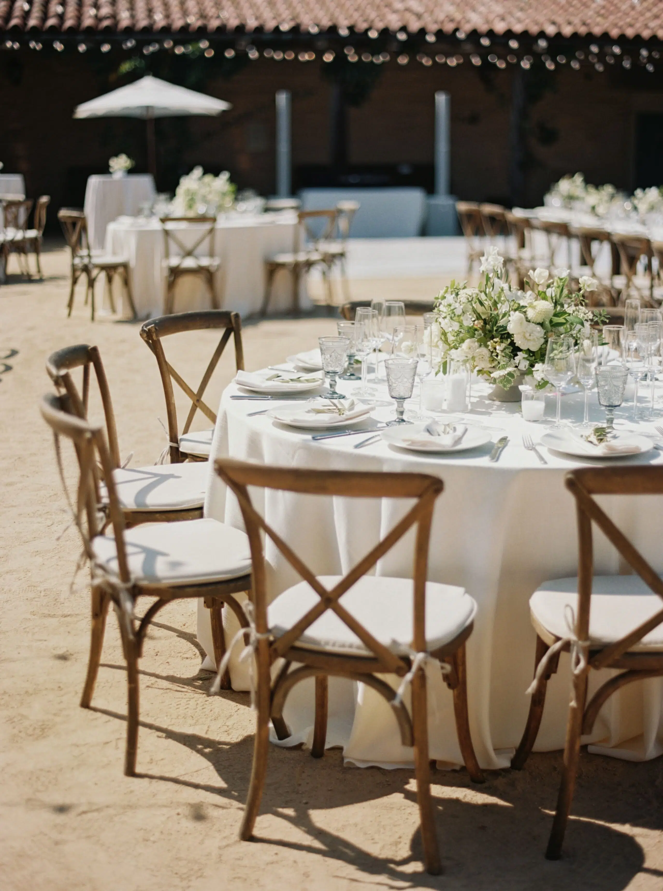 Set within the iconic courtyards of the Santa Barbara Historical Museum, this rustic wedding beautifully combined heritage architecture with warm, natural textures. Ventura Rentals curated each moment of the day, beginning with the ceremony seating of Fruitwood Folding Chairs, offering a relaxed yet refined look beneath the open sky. The reception welcomed guests with the rich character of Weathered Wood Vineyard Chairs, paired with elegant dining arrangements featuring Round Tables and the charming Straight Legs Topa Table, all styled with soft Cambria White Linen and flowing Sahara White Runner Linen.