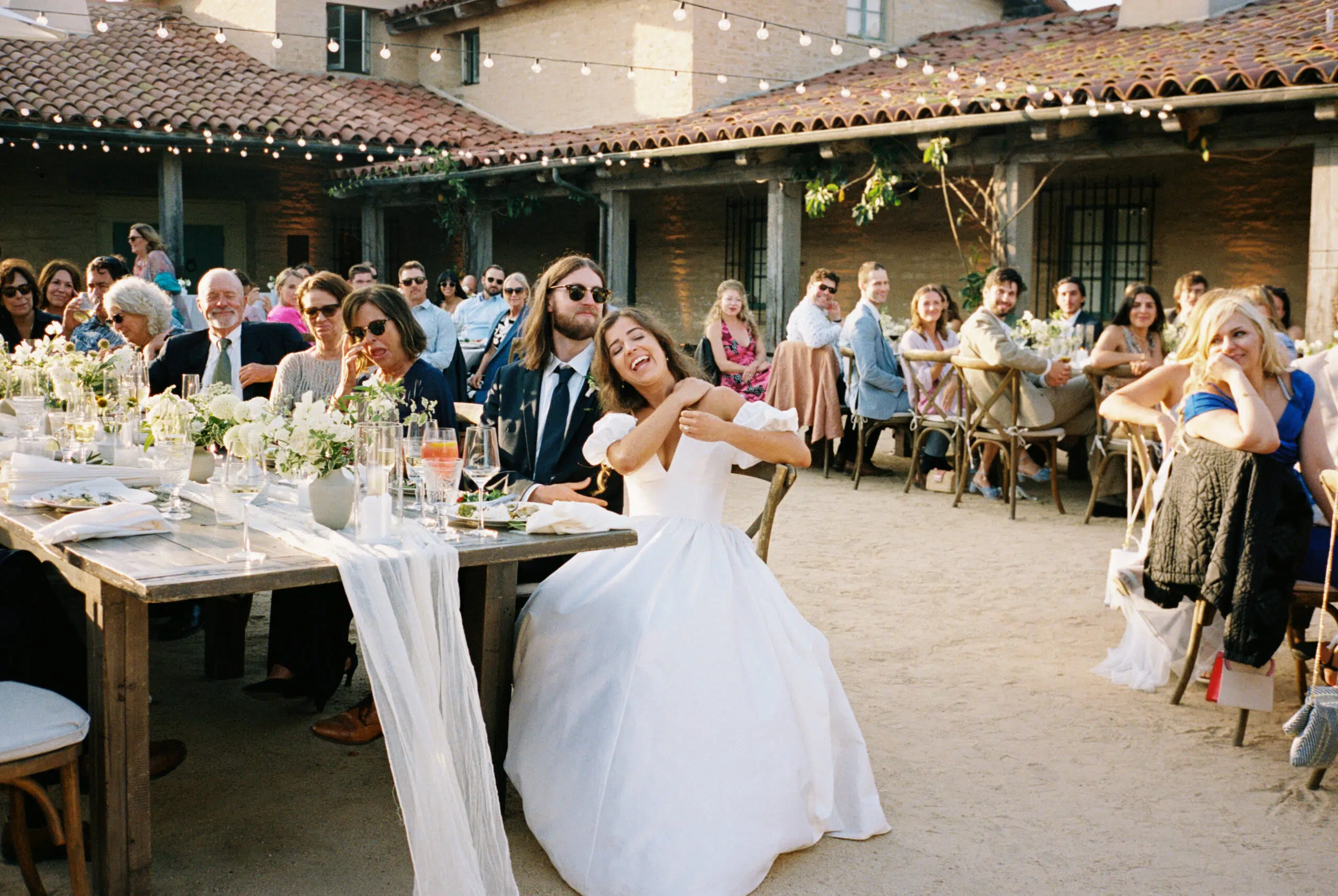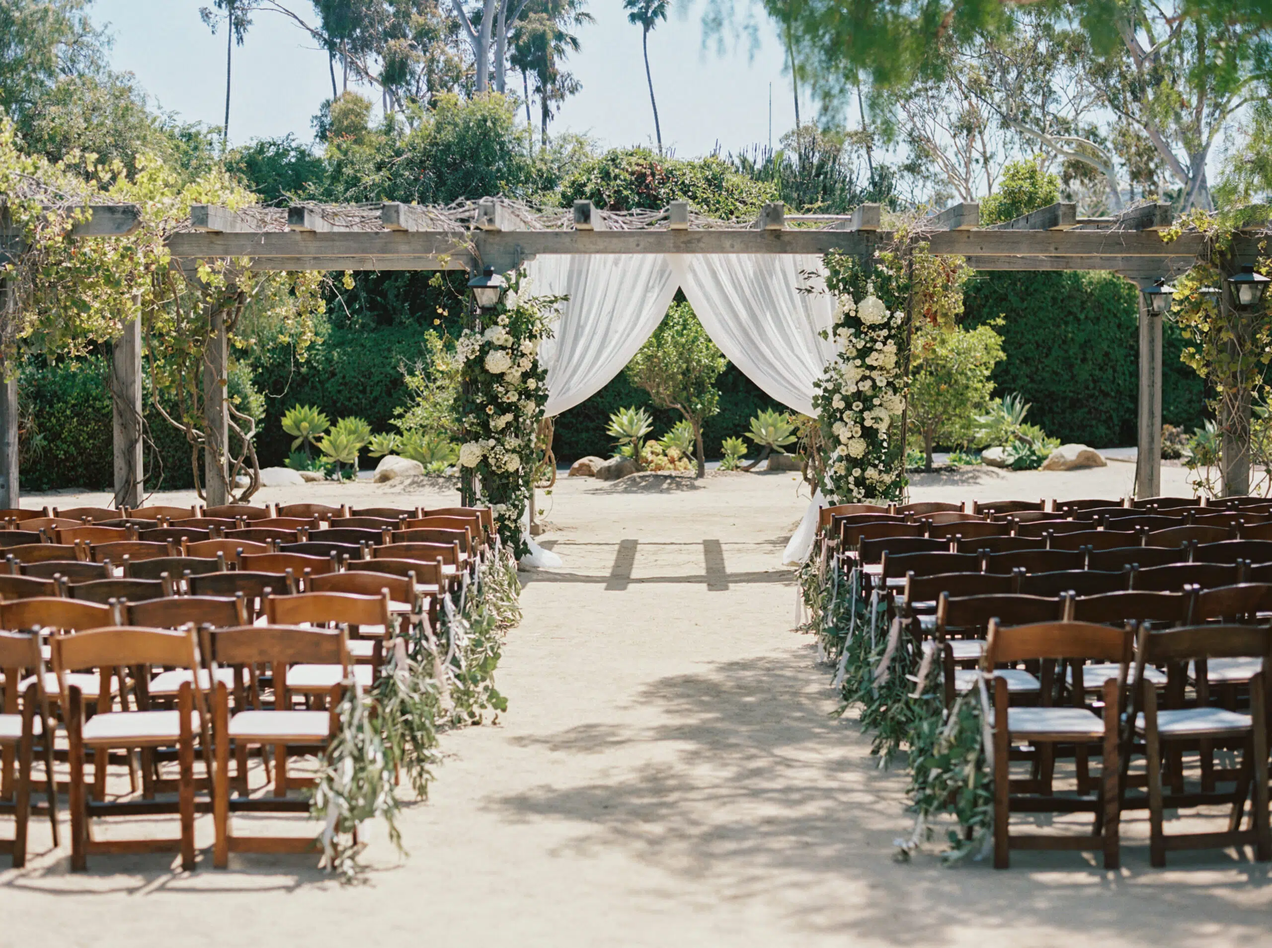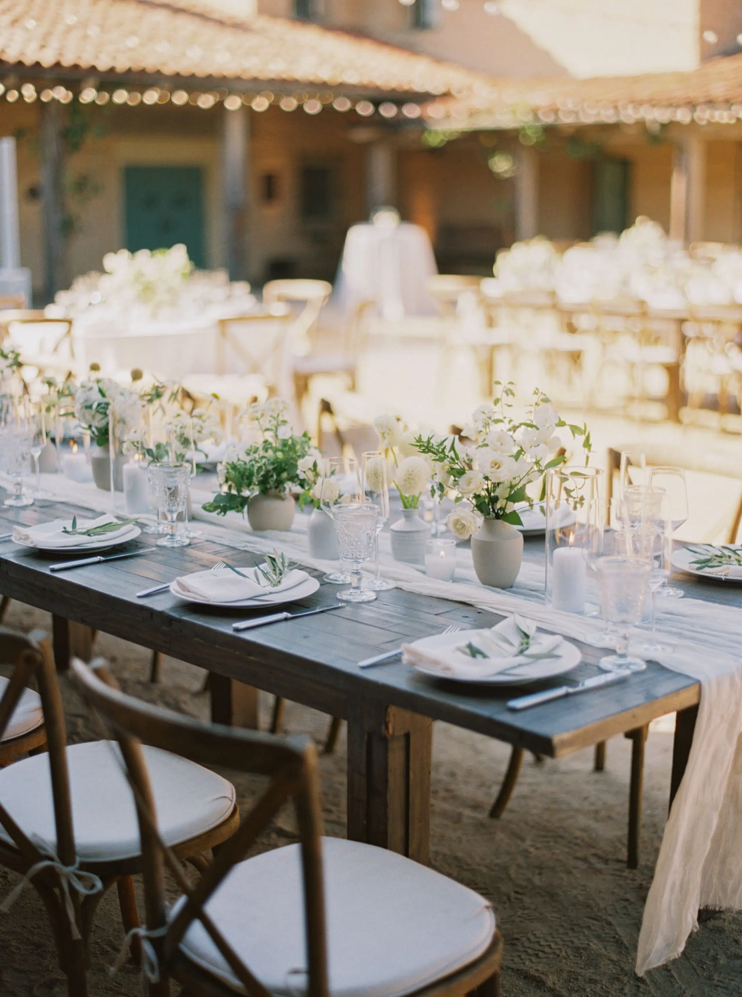 Set within the iconic courtyards of the Santa Barbara Historical Museum, this rustic wedding beautifully combined heritage architecture with warm, natural textures. Ventura Rentals curated each moment of the day, beginning with the ceremony seating of Fruitwood Folding Chairs, offering a relaxed yet refined look beneath the open sky. The reception welcomed guests with the rich character of Weathered Wood Vineyard Chairs, paired with elegant dining arrangements featuring Round Tables and the charming Straight Legs Topa Table, all styled with soft Cambria White Linen and flowing Sahara White Runner Linen.