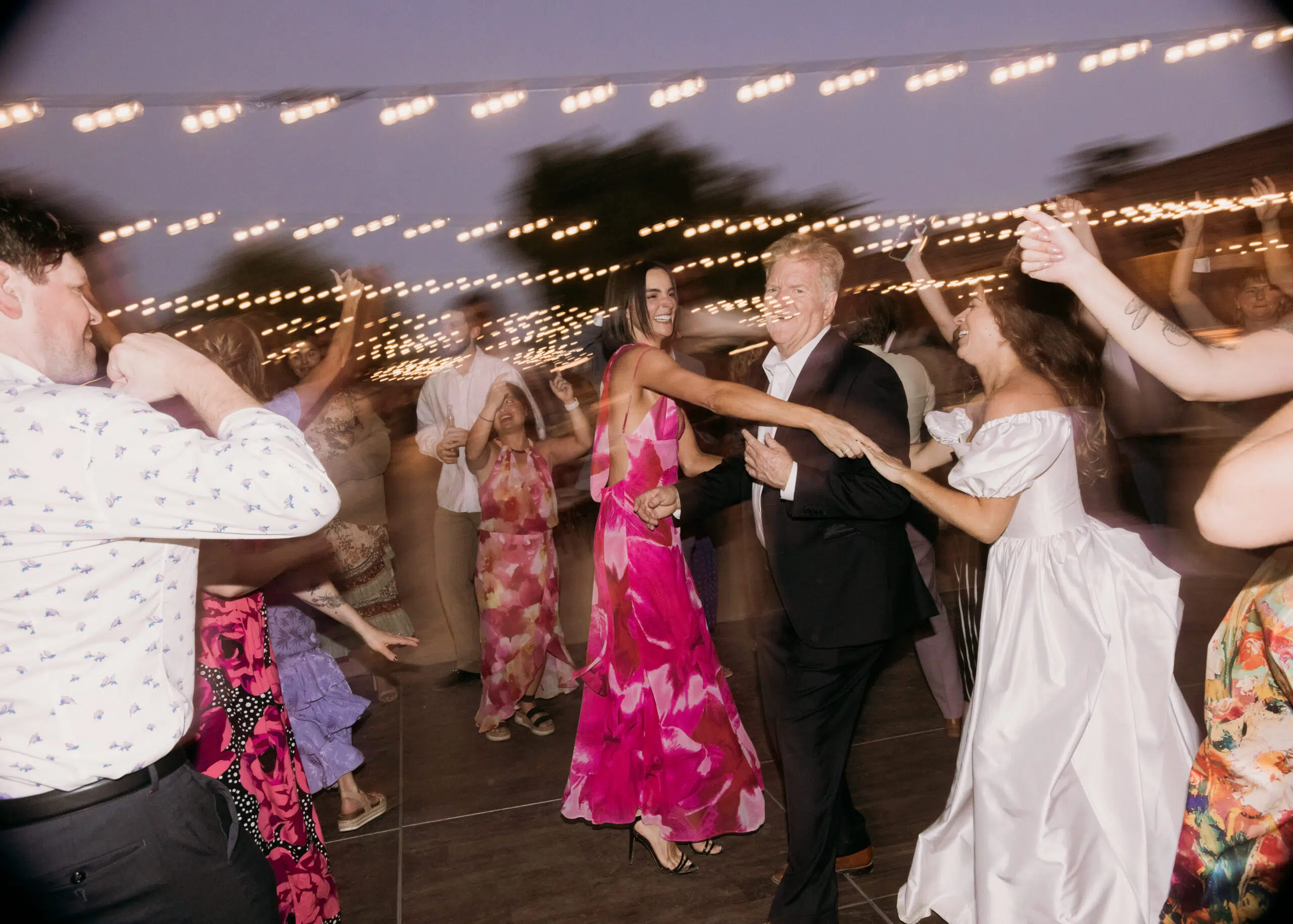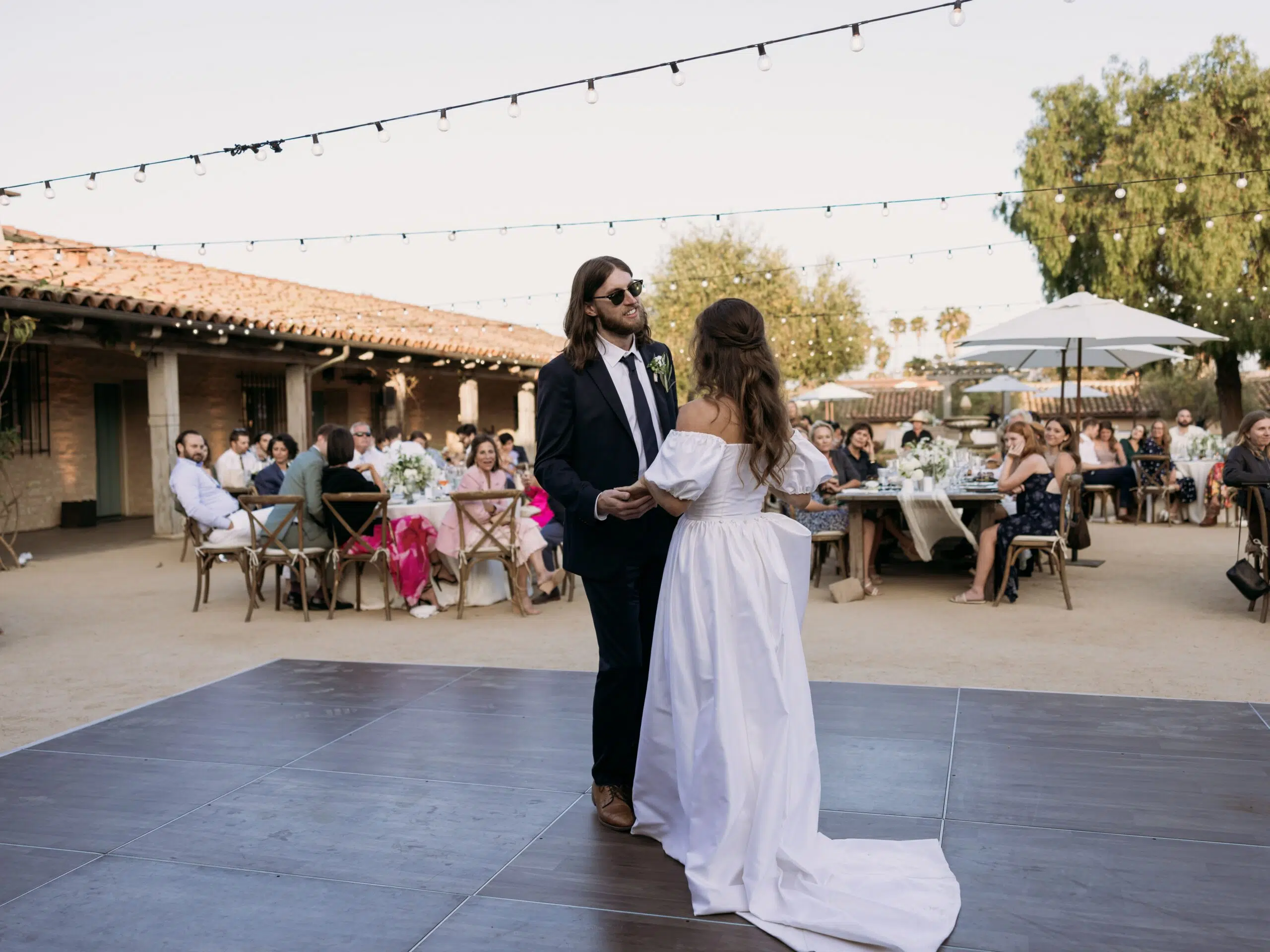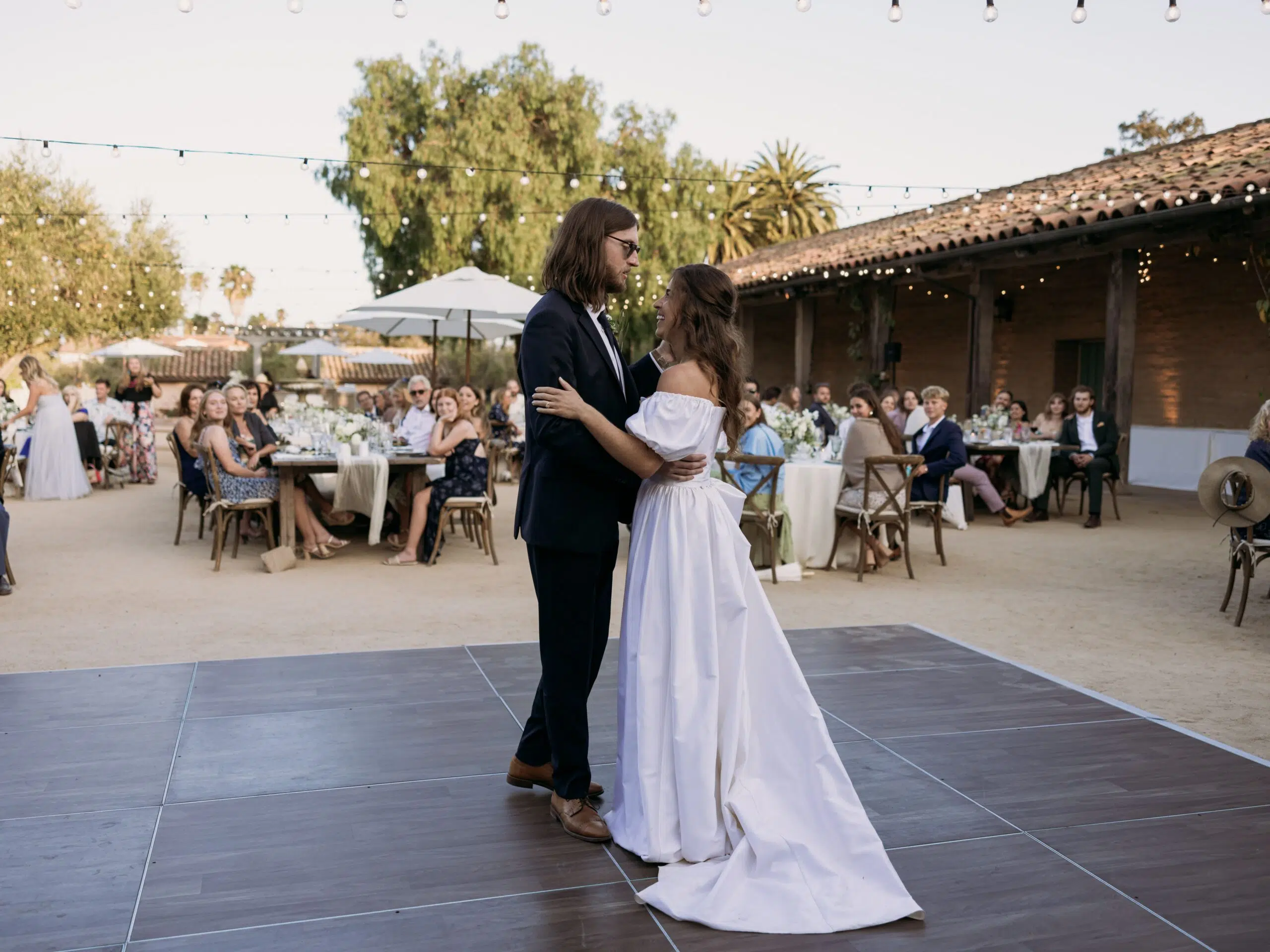 Cocktail hour was designed for effortless mingling around the Round Cocktail Table, complemented by the stylish Versailles Side Bar and inviting lounge moments with the Colmar Lovesat and Colmar Cane Chairs. The tabletop experience was elevated with Lilly Coupe China, modern Metro Stainless Flatware, and sparkling glassware including Debutante Goblets and Pure Wine Glasses. As the evening unfolded, guests gathered on the Dark Oak Dance Floor, celebrating beneath the romantic glow of Bistro Lighting W/Stands, creating an unforgettable rustic night in the heart of Santa Barbara.
