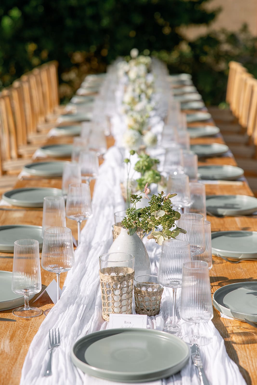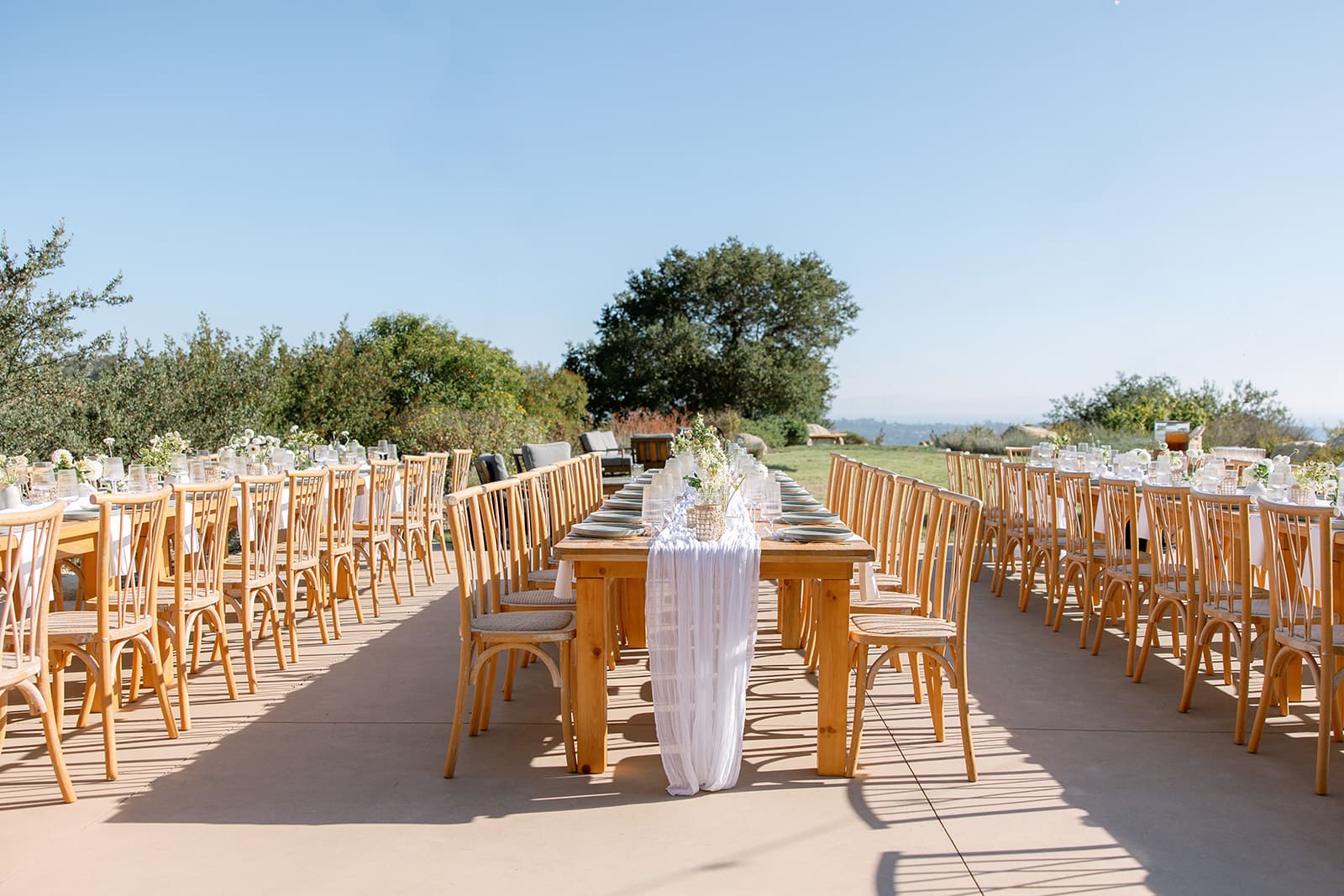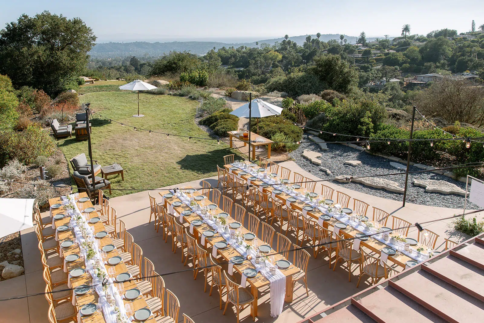 Nestled in the natural beauty of the Santa Barbara Botanic Garden, this rustic outdoor wedding captured the essence of California charm and botanical elegance. With thoughtful rentals from Ventura Rentals, every detail came together seamlessly — from the ceremony to the reception. Guests were seated comfortably on Botanical W/Rattan Seat chairs, surrounded by long Straight Legs Botanical Tables adorned with soft Sahara White Runner Linen. The tablescape came alive with earthy tones of Stella Forest Stoneware, complemented by the clean lines of Metro Stainless Flatware and the timeless shimmer of Verona Ridged Glassware. As evening fell, the warm glow of Bistro Lighting W/Stands created a romantic atmosphere under the stars, completing this stunning garden celebration.
