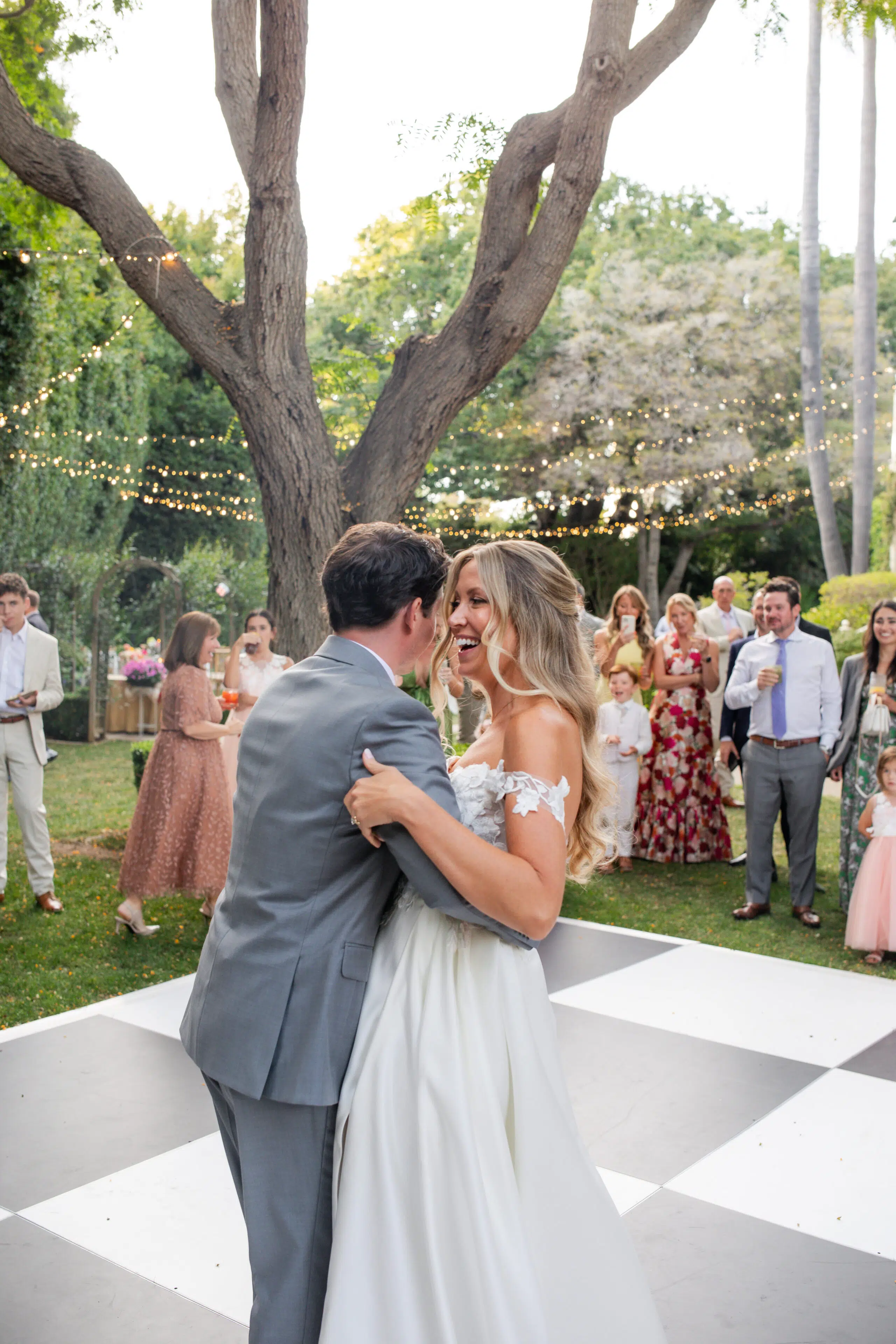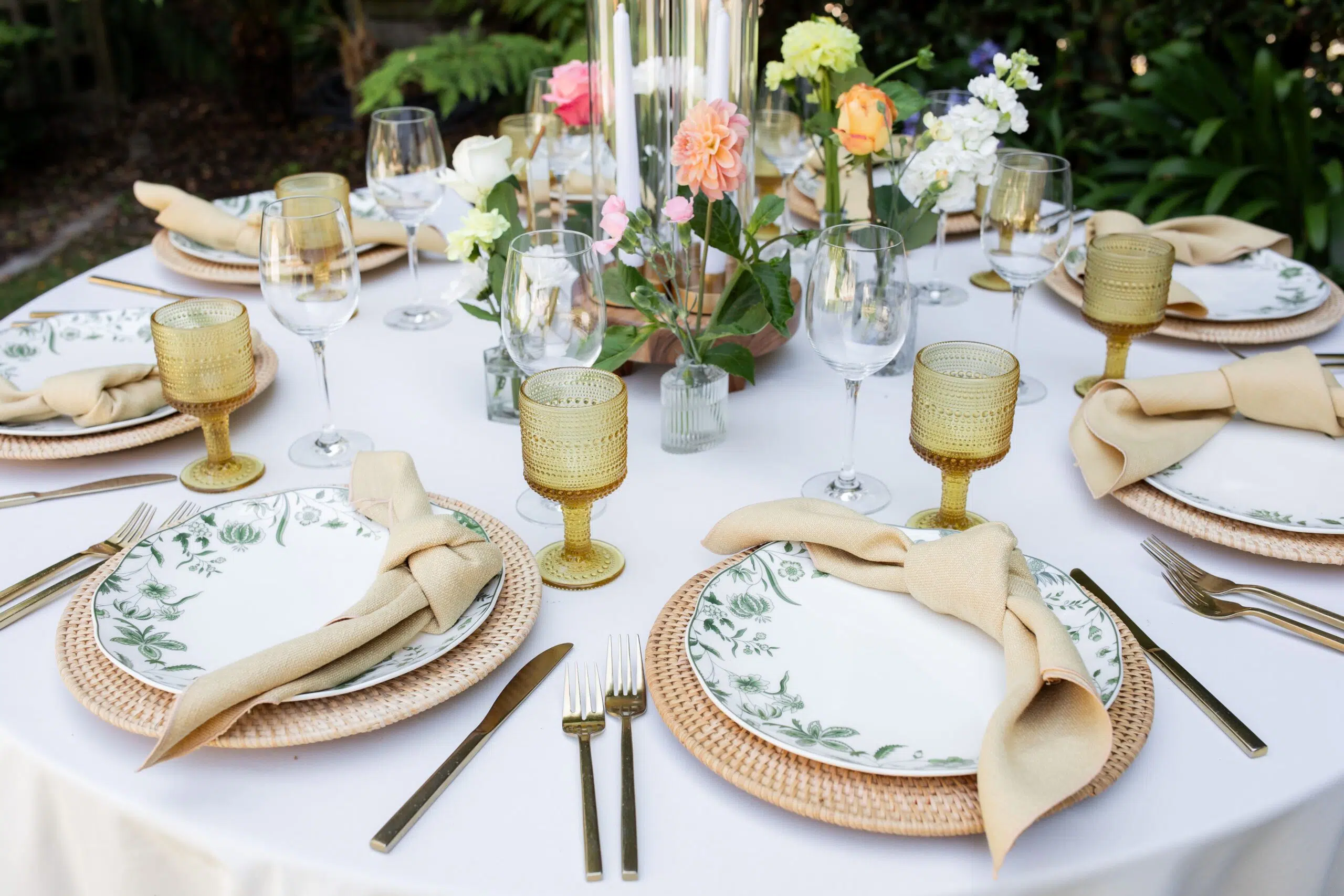 Set within the genteel gardens of Simpson House Inn in Santa Barbara, this outdoor wedding wove romance, sophistication, and a soft natural palette into every detail. Ventura Rentals outfitted the event with graceful and cohesive touches: guests settled into Botanical W/Rattan Seat Chair both for the ceremony and reception, while Round Table settings were draped in crisp White Polyester Linen. Each place was anchored by a natural-textured Rattan Honey Charger, complemented by the delicate designs of the Eleanor Fern Collection china. The gleam of Brushed Gold Flatware added a warm metallic accent, and the Classico Wine glasses paired beautifully with the elegant Jupiter Goblets for toasts. As twilight deepened, couples took the floor beneath string lights on a dramatic Black & White Dance Floor, creating a striking focal point where romance and celebration danced hand in hand.